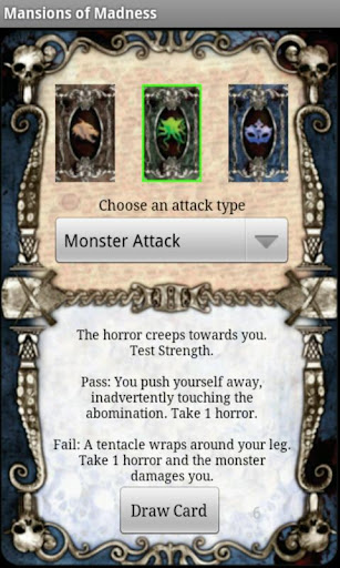 This app will help the Keeper keep up with the health and sanity of the players. It will also provide the keeper with the current set of combat cards. This app allows you to chose a card type and attack type and then will randomly pick a card based on those choices.